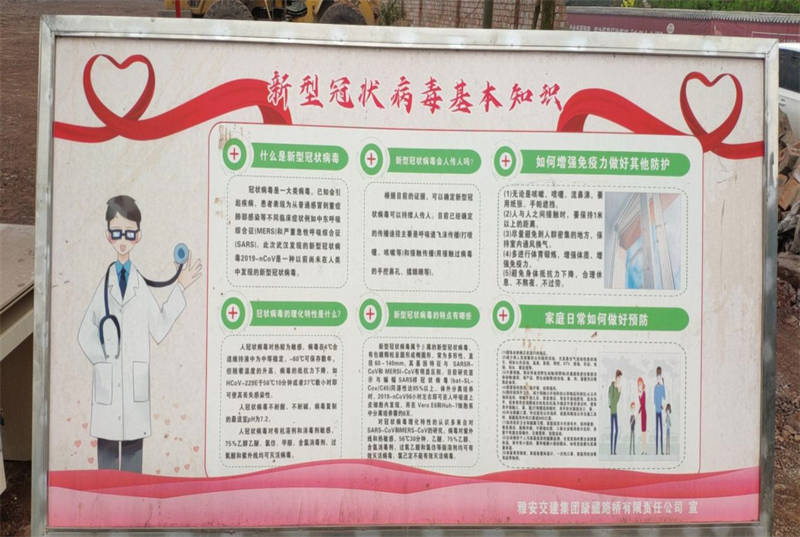 一是創(chuàng)新宣傳形式,利用公司QQ群、微信群、推送《中華人民共和國傳染病防治法》、《四川省應(yīng)對新冠肺炎疫情分區(qū)分級差異化防控指南(第二版)》、《雅安市新型冠狀病毒肺炎疫情防控工作要點指引》等法律法規(guī),每日持續(xù)有效的傳播疫情防控的信息,加大健康教育宣傳,引導職工不信謠不傳謠,營造良好的輿論環(huán)境。二是落實責任主體,在公司、各項目部張貼疫情防控法制宣傳展板、懸掛宣傳橫幅、發(fā)放防控宣傳冊,設(shè)立疫情防控教育專欄,向項目參建人員宣講疫情防控知識,做好疫情群防群治工作,營造濃厚的防控宣傳氛圍。三是精準發(fā)力,組織已進場勞務(wù)人員開展疫情防控及復工復產(chǎn)安全教育培訓,確保項目復工復產(chǎn)和疫情防控工作有序推進。