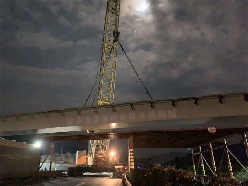 雅西跨線橋混凝土預(yù)制箱梁共計(jì)4片,本次架設(shè)的箱梁重140噸、長55余米,體積大、自身重、運(yùn)輸困難,且投入的大型機(jī)械設(shè)備較多,施工組織難度大。為順利完成架設(shè)任務(wù),市交通局多次組織召開專題會(huì)議,提前謀劃、細(xì)致安排、優(yōu)化組織,制定了施工專項(xiàng)方案和應(yīng)急措施。