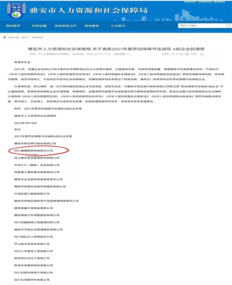 近日,根據(jù)《雅安市人力資源和社會(huì)保障局關(guān)于表揚(yáng)2021年度勞動(dòng)保障守法誠信 A級(jí)企業(yè)的通報(bào)》,雅安交通建設(shè)(集團(tuán))有限責(zé)任公司下屬四川康藏路橋有限責(zé)任公司榮獲2021年度勞動(dòng)保障守法誠信 A級(jí)企業(yè),名列我市“誠信紅榜”。