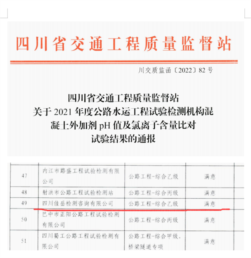 5月11日,四川省交通工程質(zhì)量監(jiān)督站印發(fā)《關(guān)于2021年度公路水運(yùn)工程試驗(yàn)檢測機(jī)構(gòu)混凝土外加劑PH值及氯離子含量比對試驗(yàn)結(jié)果的通報(bào),交建集團(tuán)四川佳岳檢測咨詢有限公司獲得“滿意”評價(jià)。