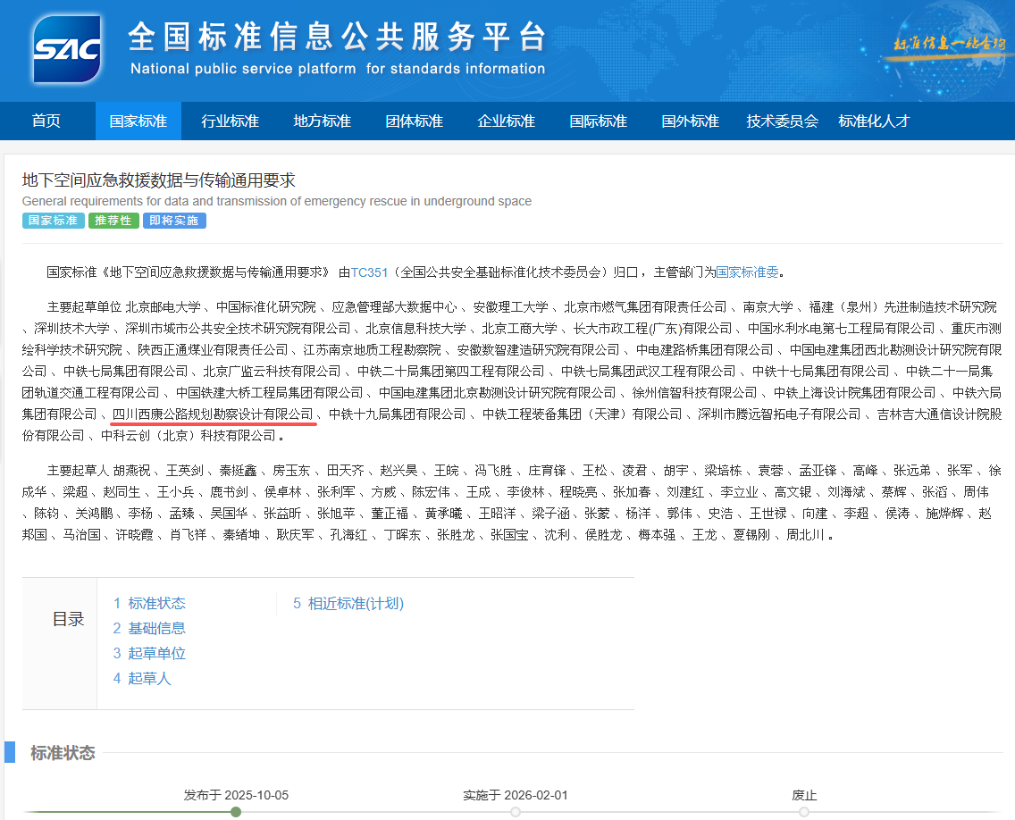 近日,由四川西康公路規(guī)劃勘察設(shè)計(jì)有限公司參與編制的推薦性國家標(biāo)準(zhǔn)GB/T 46338-2025《地下空間應(yīng)急救援?dāng)?shù)據(jù)與傳輸通用要求》經(jīng)國家標(biāo)準(zhǔn)委批準(zhǔn)正式發(fā)布,將于2026年2月1日起正式實(shí)施。