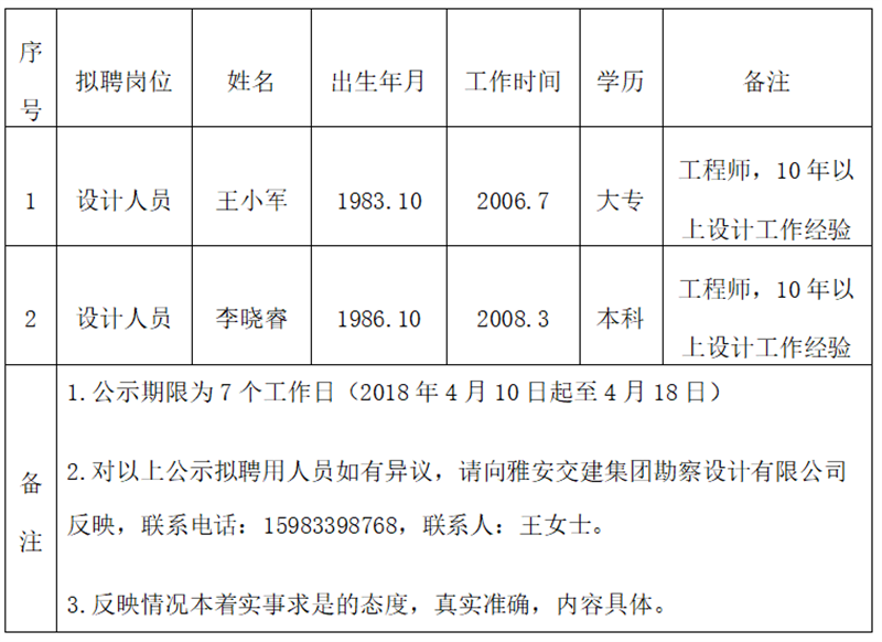 通過公開報名、資格審查、面試等程序,經(jīng)雅安交建集團(tuán)勘察設(shè)計有限公司研究擇優(yōu)確定以下2名擬聘用人員,現(xiàn)公示名單如下: