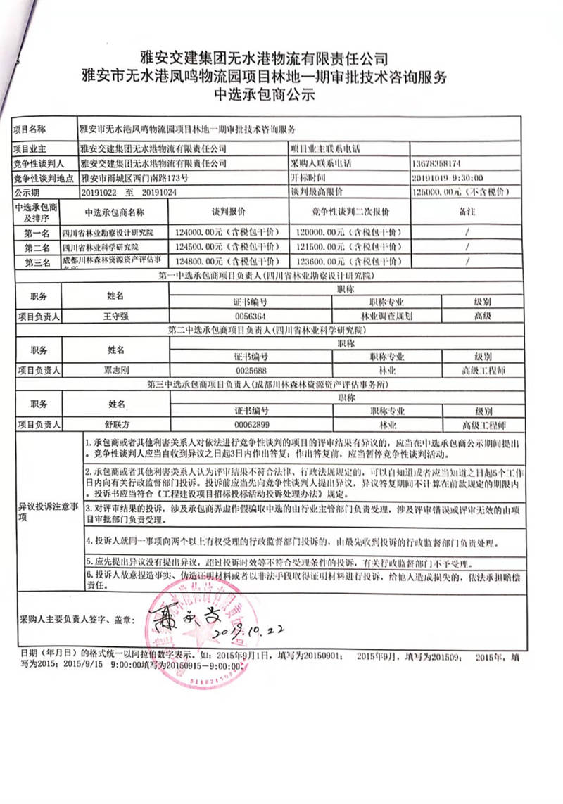 雅安交建集團(tuán)無水港物流有限責(zé)任公司雅安市無水港鳳鳴物流園項目林地一期審批技術(shù)咨詢服務(wù)中選承包商公示