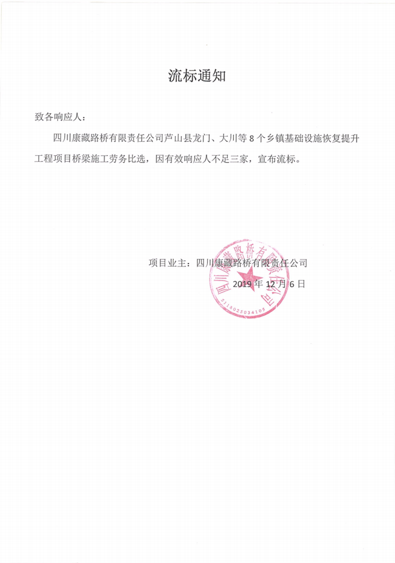 四川康藏路橋有限責(zé)任公司蘆山縣龍門(mén)、大川等8個(gè)鄉(xiāng)鎮(zhèn)基礎(chǔ)設(shè)施恢復(fù)提升工程項(xiàng)目橋梁施工勞務(wù)比選流標(biāo)通知
