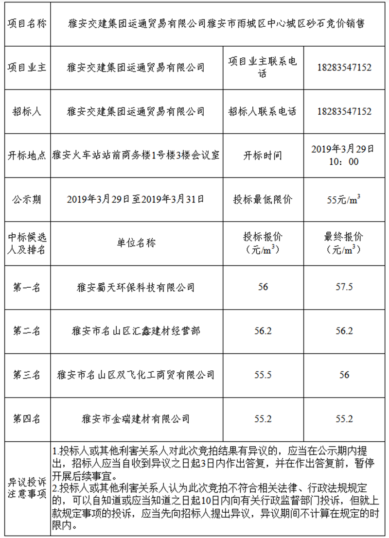 雅安交建集團(tuán)運(yùn)通貿(mào)易有限公司關(guān)于雅安市雨城區(qū)中心城區(qū)砂石競拍結(jié)果公示