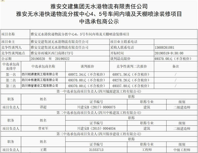 雅安無水港快遞物流分撥中心4、5號車間內墻及天棚噴涂裝修項目中選承包商公示