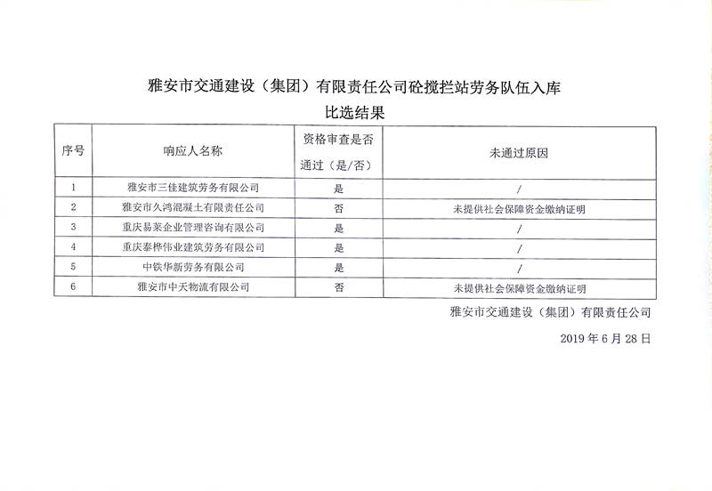 雅安市交通建設(shè)(集團)有限責任公司砼攪攔站勞務隊伍入庫比選結(jié)果