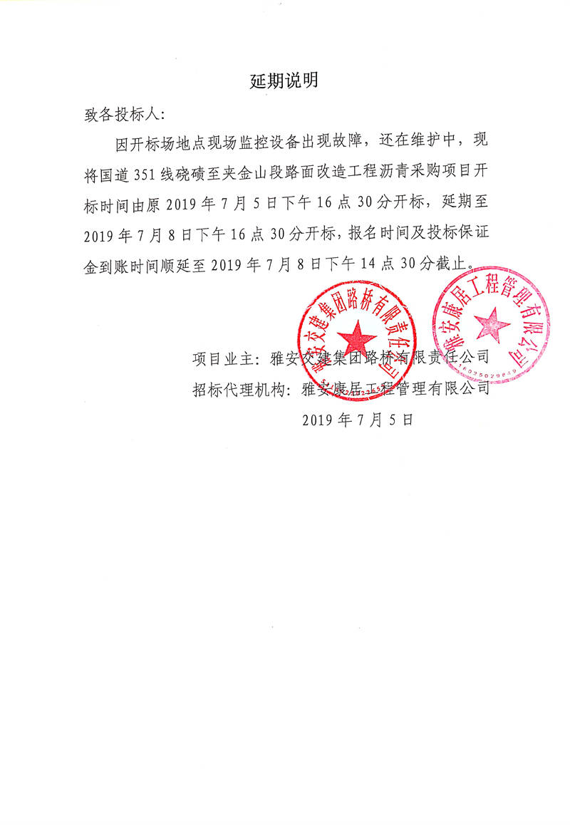 雅安交建集團路橋有限責任公司國道351線磽磧至夾金山段路面改造工程瀝青采購招標延期說明