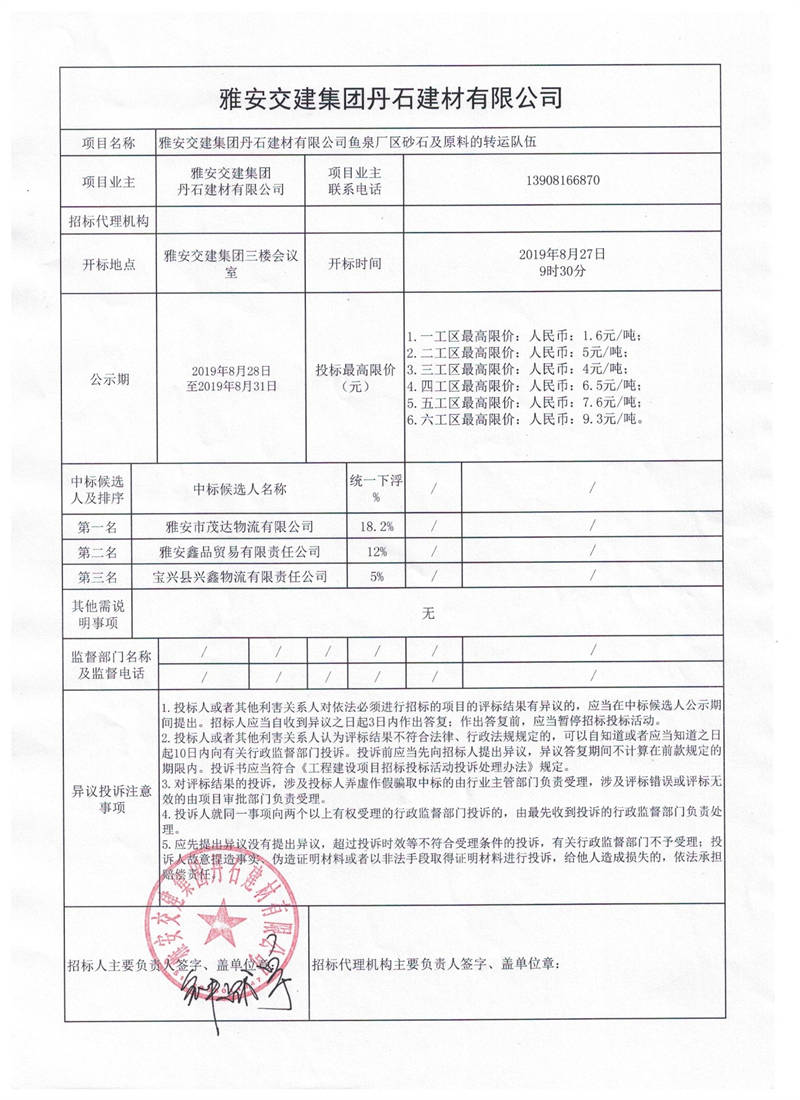 雅安交建集團(tuán)丹石建材有限公司魚泉廠區(qū)砂石及原料的轉(zhuǎn)運(yùn)隊(duì)伍項(xiàng)目競(jìng)價(jià)結(jié)果公示