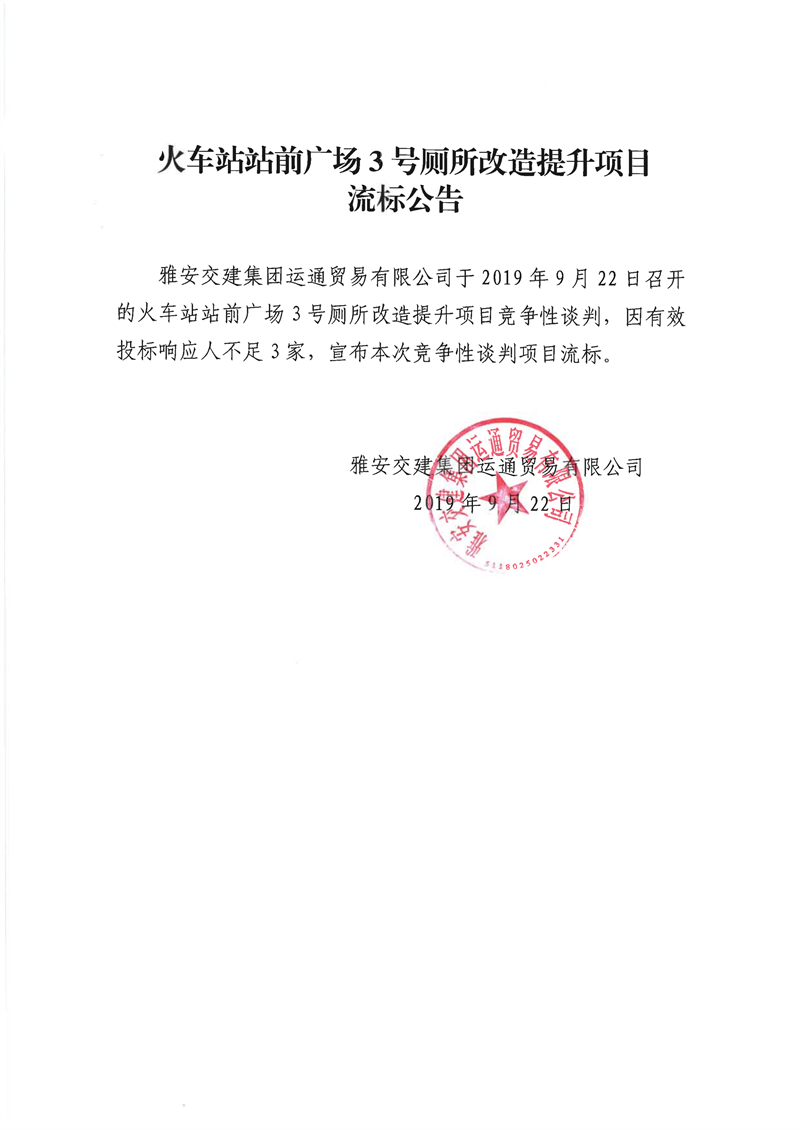 雅安交建集團(tuán)運(yùn)通貿(mào)易有限公司火車站站前廣場3號(hào)廁所改造提升項(xiàng)目流標(biāo)公告
