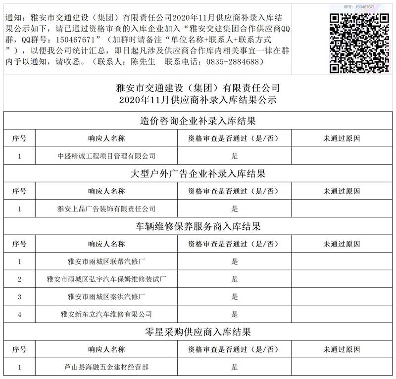 雅安市交通建設(shè)(集團(tuán))有限責(zé)任公司2020年11月供應(yīng)商補(bǔ)錄入庫結(jié)果公示