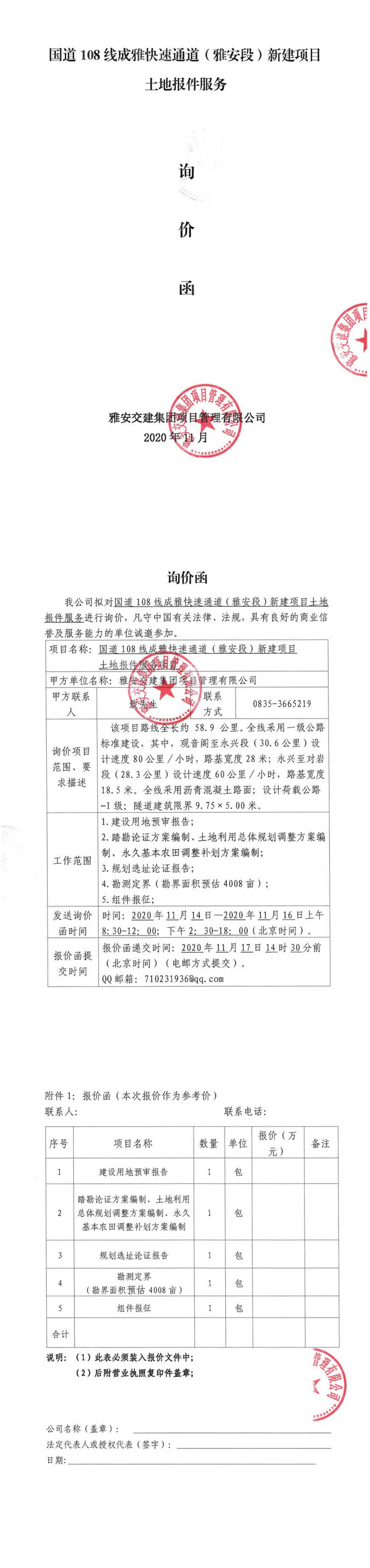 雅安交建集團(tuán)項(xiàng)目管理有限公司國道108線成雅快速通道(雅安段)新建項(xiàng)目土地報(bào)件服務(wù)項(xiàng)目詢價(jià)函
