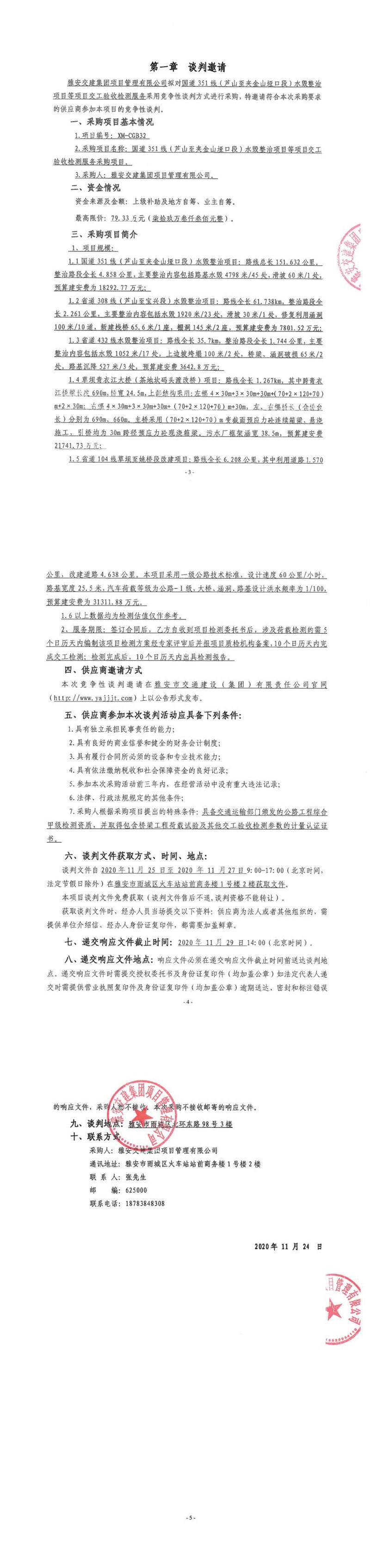 雅安交建集團(tuán)項(xiàng)目管理有限公司國道351線(蘆山至夾金山埡口段)水毀整治項(xiàng)目等項(xiàng)目交工驗(yàn)收檢測服務(wù)采購項(xiàng)目競爭性談判公告