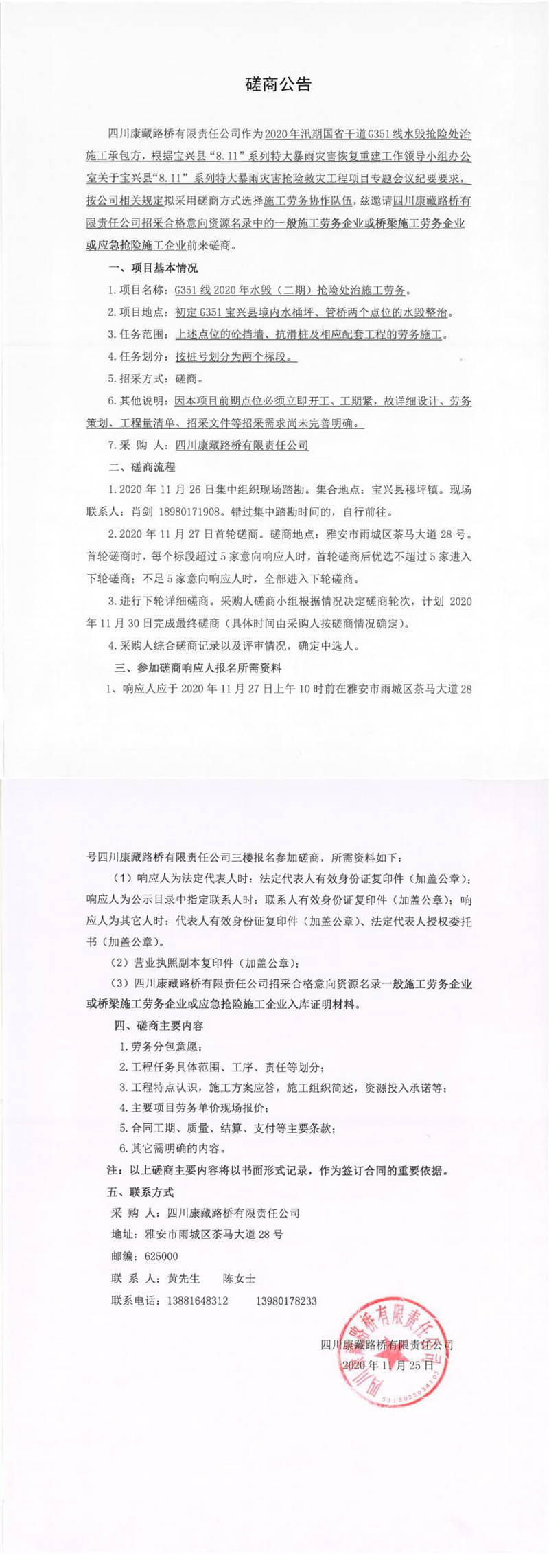 四川康藏路橋有限責(zé)任公司G351線2020年水毀(二期)搶險(xiǎn)處治施工勞務(wù)磋商公告