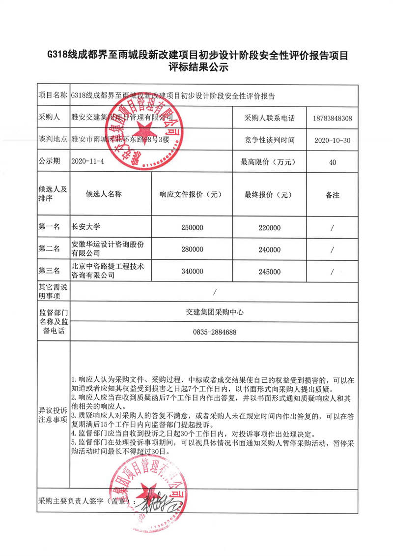 雅安交建集團(tuán)項(xiàng)目管理有限公司G318線成都界至雨城段新改建項(xiàng)目初步設(shè)計(jì)階段安全性評價(jià)報(bào)告項(xiàng)目評標(biāo)結(jié)果公示
