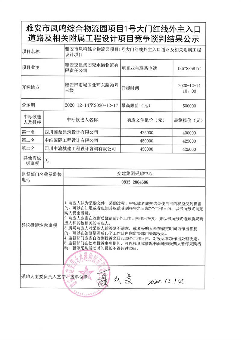 雅安交建集團無水港物流有限責任公司雅安市鳳鳴綜合物流園項目1號大門紅線外主入口道路及相關附屬工程設計項目談判結(jié)果公示