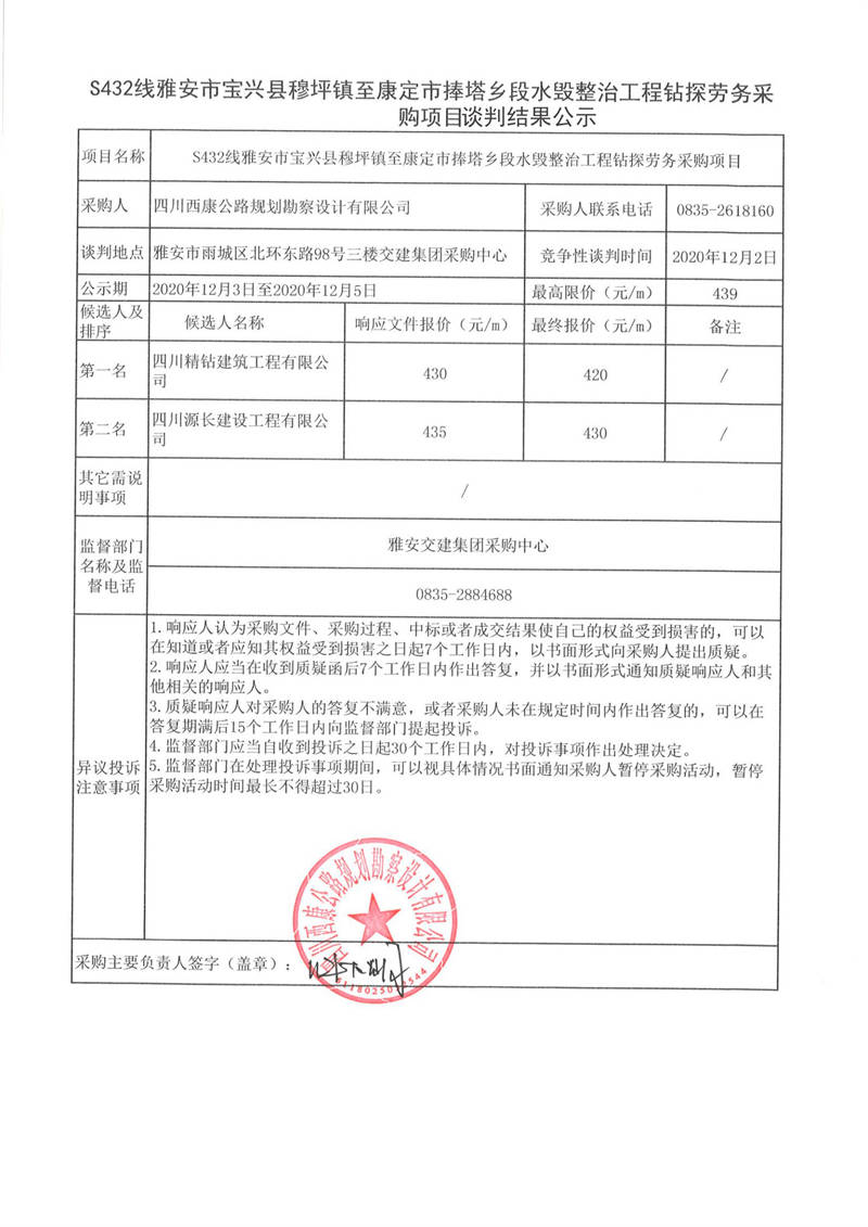 四川西康公路規(guī)劃勘察設(shè)計(jì)有限公司S432線雅安市寶興縣穆坪鎮(zhèn)至康定市捧塔鄉(xiāng)段水毀整治工程鉆探勞務(wù)采購項(xiàng)目談判結(jié)果公示