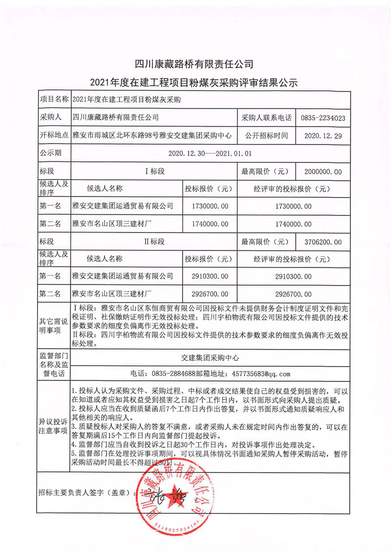 四川康藏路橋有限責(zé)任公司2021年度在建工程項目粉煤灰采購評審結(jié)果公示