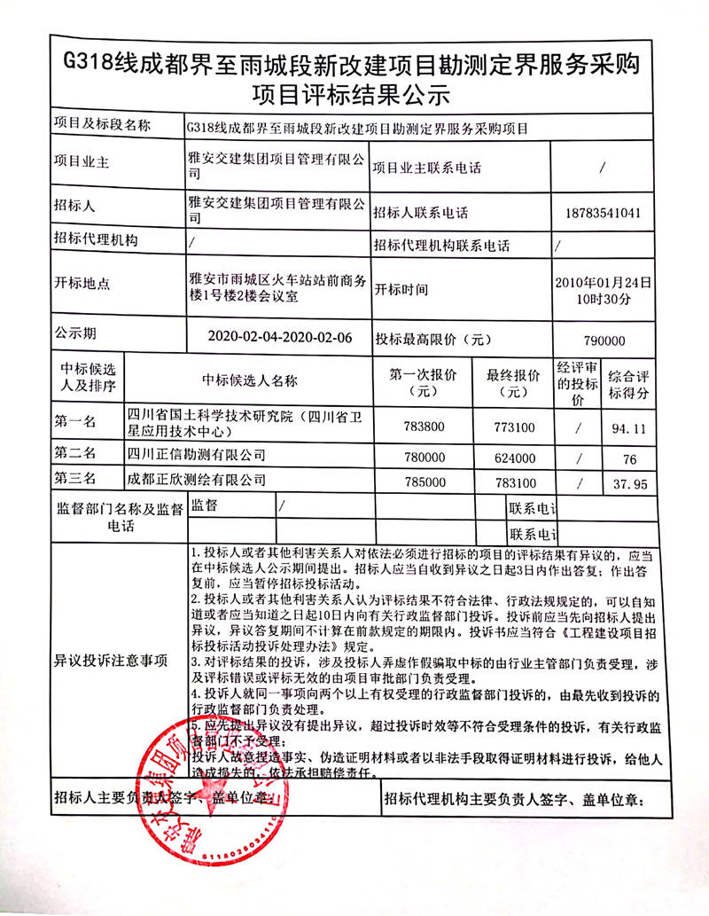 雅安交建集團項目管理有限公司G318線成都界至雨城段新改建項目勘測定界服務采購項目評標結(jié)果公示