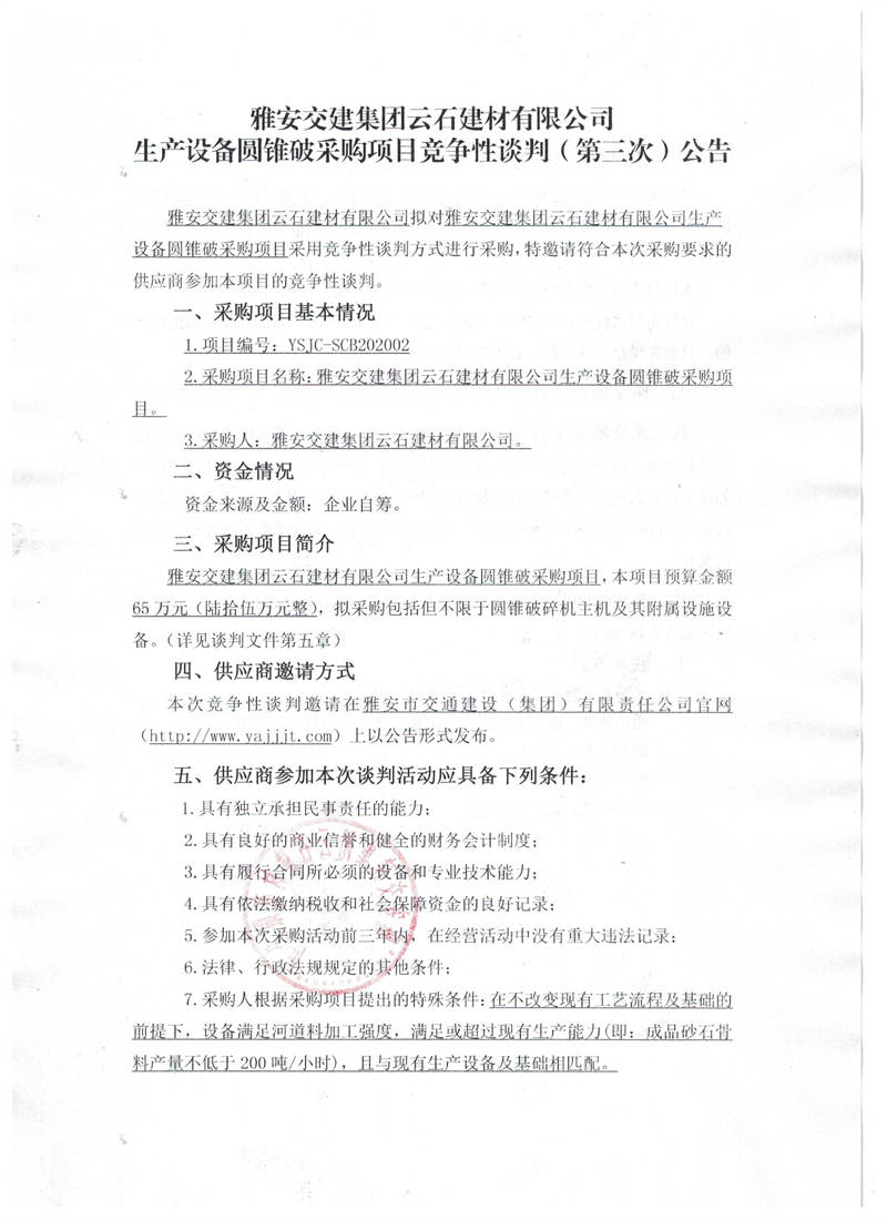 雅安交建集團云石建材有限公司生產(chǎn)設(shè)備圓錐破采購項目競爭性談判(第三次)公告