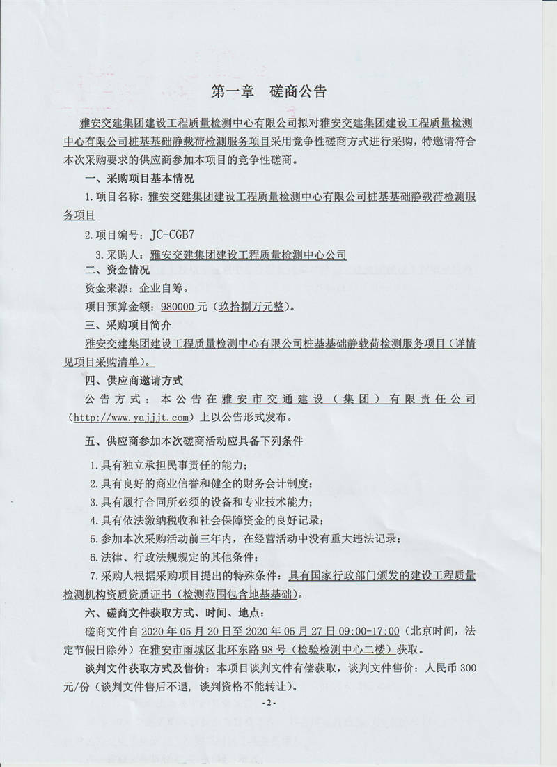 雅安交建集團(tuán)建設(shè)工程質(zhì)量檢測中心有限公司樁基基礎(chǔ)靜載荷檢測服務(wù)采購項目競爭性磋商公告