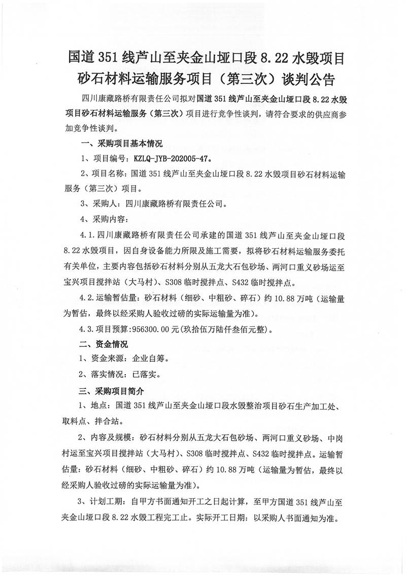 四川康藏路橋有限責(zé)任公司國道351線蘆山至夾金山埡口段8.22水毀項目砂石材料運輸服務(wù)項目(第三次)談判公告