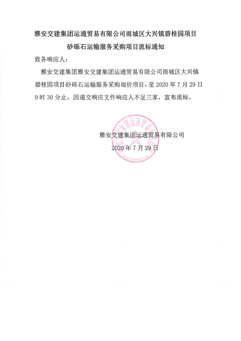 雅安交建集團(tuán)運(yùn)通貿(mào)易有限公司雨城區(qū)大興鎮(zhèn)碧桂園砂礫石運(yùn)輸服務(wù)采購項(xiàng)目流標(biāo)通知