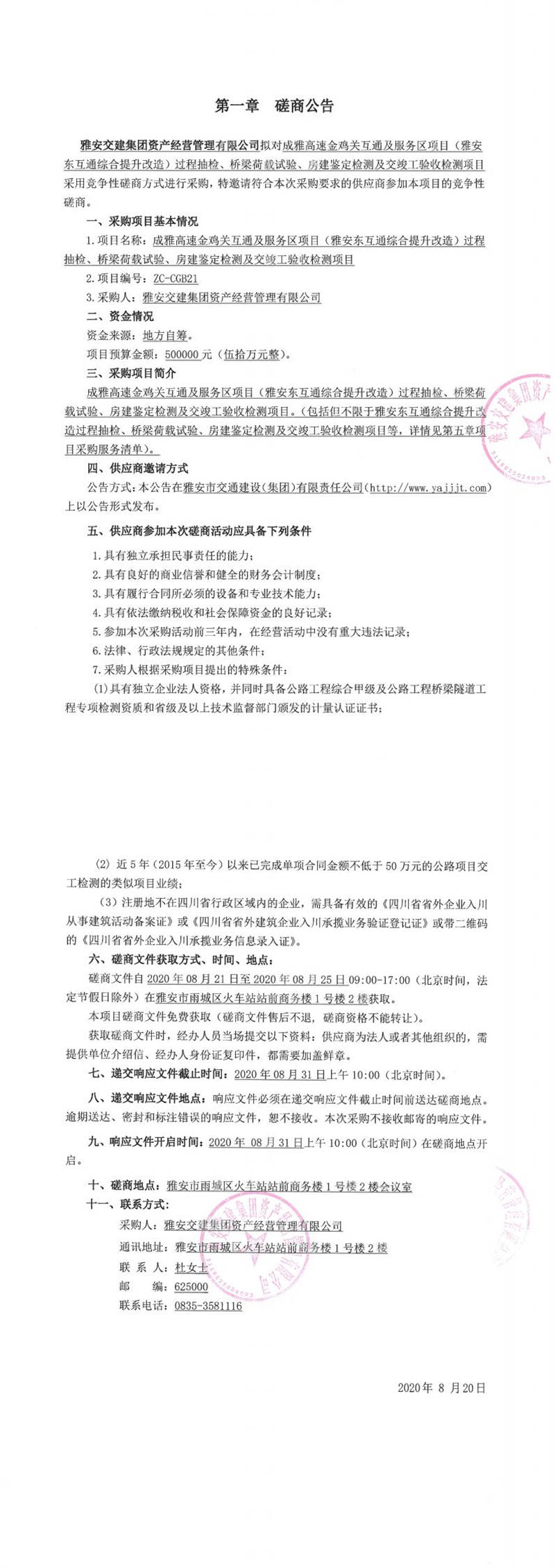 雅安交建集團(tuán)資產(chǎn)經(jīng)營管理有限公司成雅高速金雞關(guān)互通及服務(wù)區(qū)項(xiàng)目(雅安東互通綜合提升改造)過程抽檢、橋梁荷載試驗(yàn)、房建鑒定檢測(cè)及交竣工驗(yàn)收檢測(cè)項(xiàng)目磋商公告