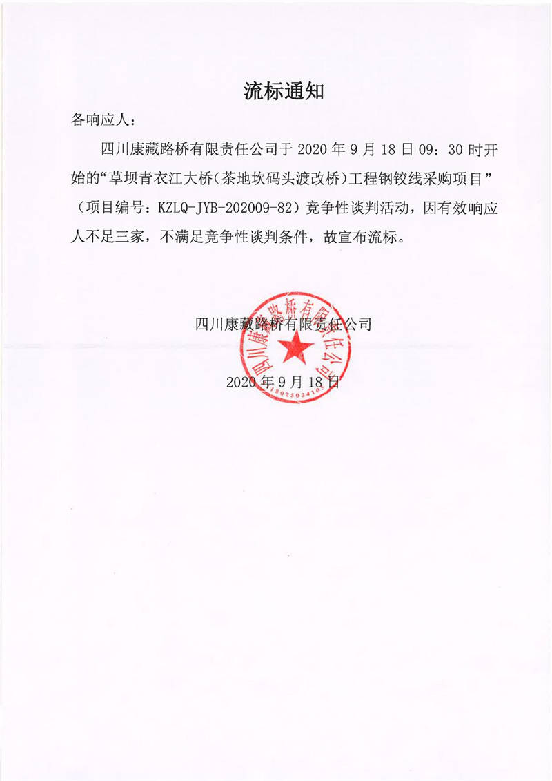 四川康藏路橋有限責任公司草壩青衣江大橋(茶地坎碼頭渡改橋)工程鋼鉸線采購項目流標通知
