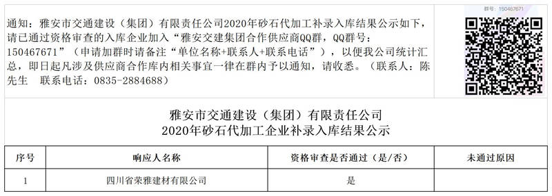 雅安市交通建設(shè)(集團(tuán))有限責(zé)任公司2020年砂石代加工企業(yè)補(bǔ)錄入庫結(jié)果公示