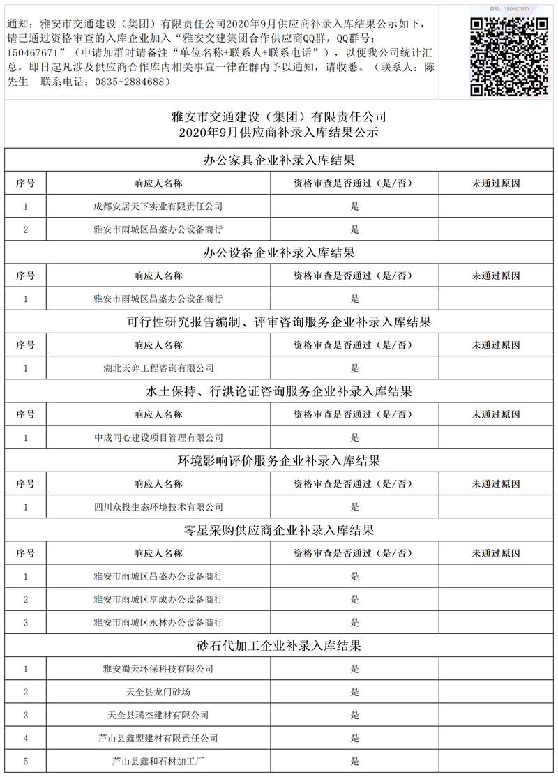 雅安市交通建設(shè)(集團(tuán))有限責(zé)任公司2020年9月供應(yīng)商補錄入庫結(jié)果公示