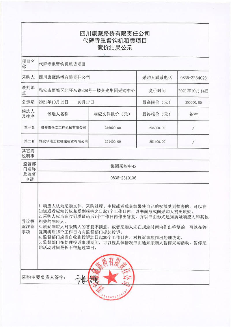 四川康藏路橋有限責(zé)任公司代碑寺重臂鉤機(jī)租賃項(xiàng)目競(jìng)價(jià)結(jié)果公示