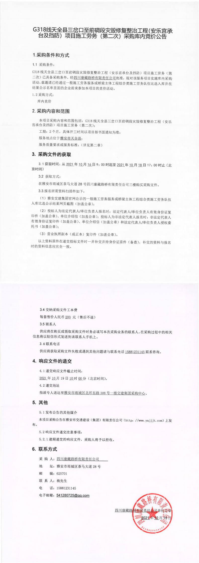 四川康藏路橋有限責任公司G318線天全縣三岔口至前碉段災(zāi)毀修復(fù)整治工程(安樂宮承臺及擋防)項目施工勞務(wù)(第二次)采購庫內(nèi)競價公告