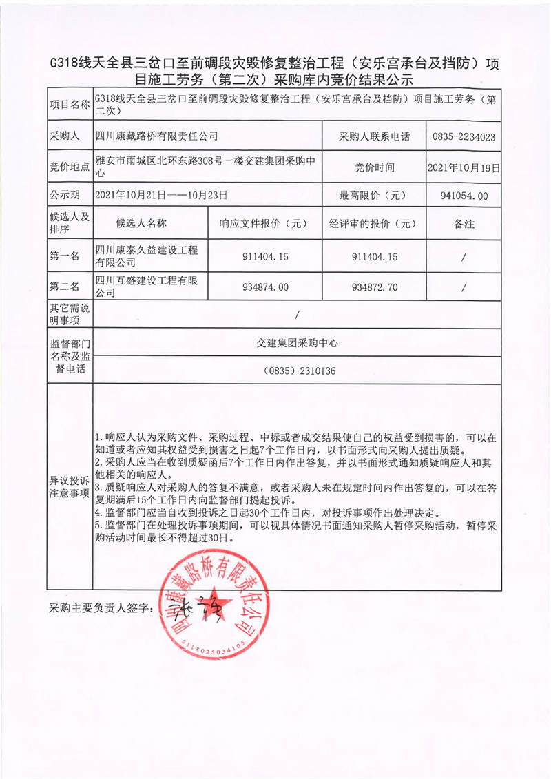 四川康藏路橋有限責(zé)任公司G318線天全縣三岔口至前碉段災(zāi)毀修復(fù)整治工程(安樂宮承臺(tái)及擋防)項(xiàng)目施工勞務(wù)(第二次)采購(gòu)庫(kù)內(nèi)競(jìng)價(jià)結(jié)果公示
