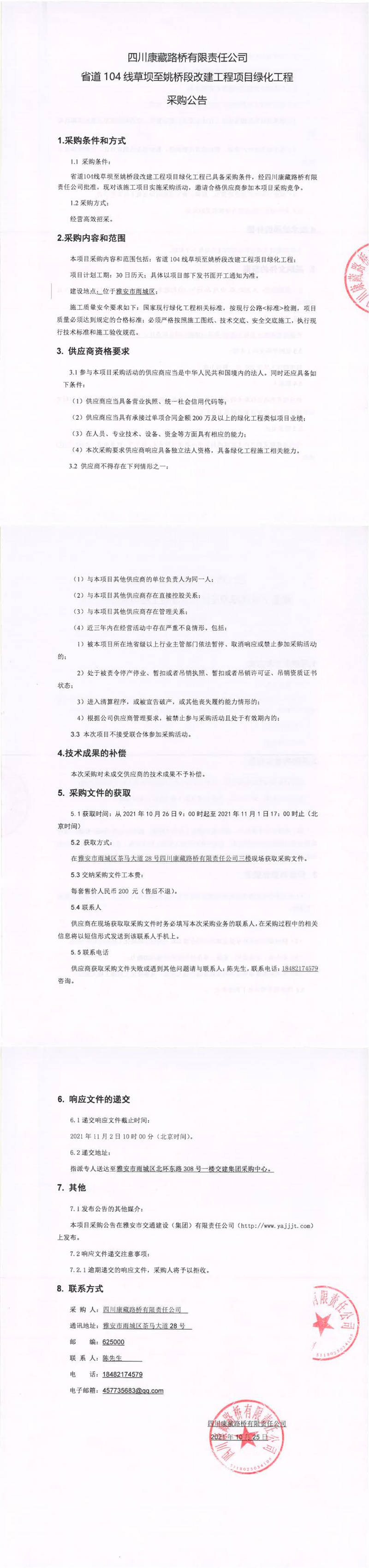 四川康藏路橋有限責(zé)任公司省道104線草壩至姚橋段改建工程項目綠化工程采購公告