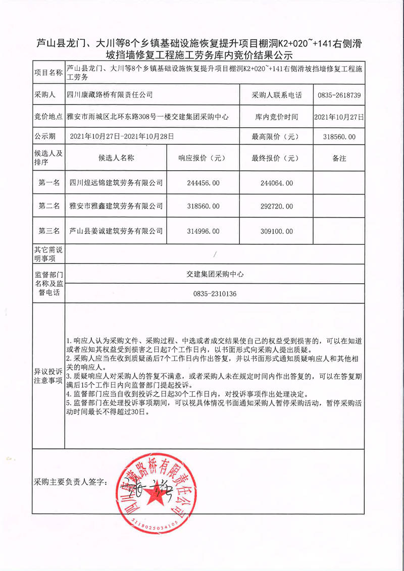 四川康藏路橋有限責任公司蘆山縣龍門、大川等8個鄉(xiāng)鎮(zhèn)基礎設施恢復提升項目棚洞K2+020~+141右側(cè)滑坡?lián)鯄π迯凸こ淌┕趧諑靸?nèi)競價結(jié)果公示