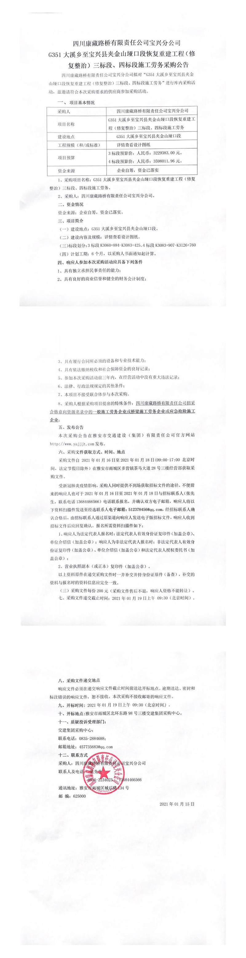 四川康藏路橋有限責(zé)任公司寶興分公司G351線寶興縣大溪鄉(xiāng)至寶興縣夾金山埡口段恢復(fù)重建工程(修復(fù)整治)三標(biāo)段、四標(biāo)段施工勞務(wù)采購(gòu)公告