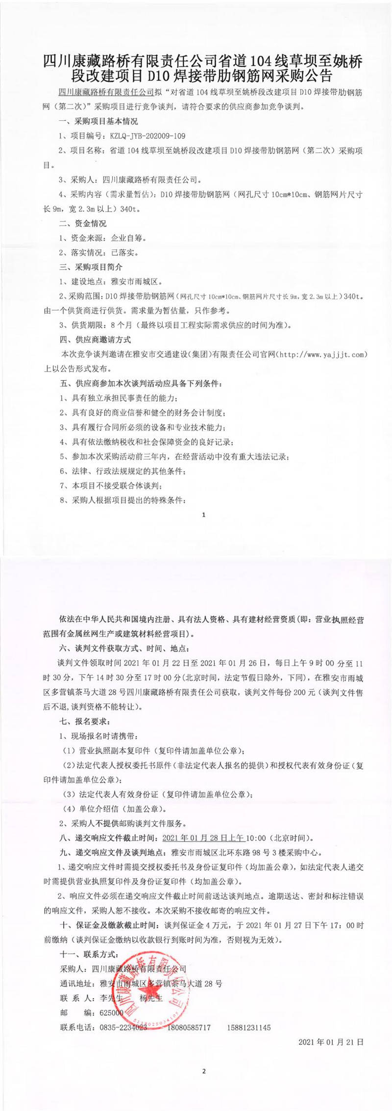 四川康藏路橋有限責(zé)任公司省道104線草壩至姚橋段改建項目D10焊接帶肋鋼筋網(wǎng)(第二次)采購公告