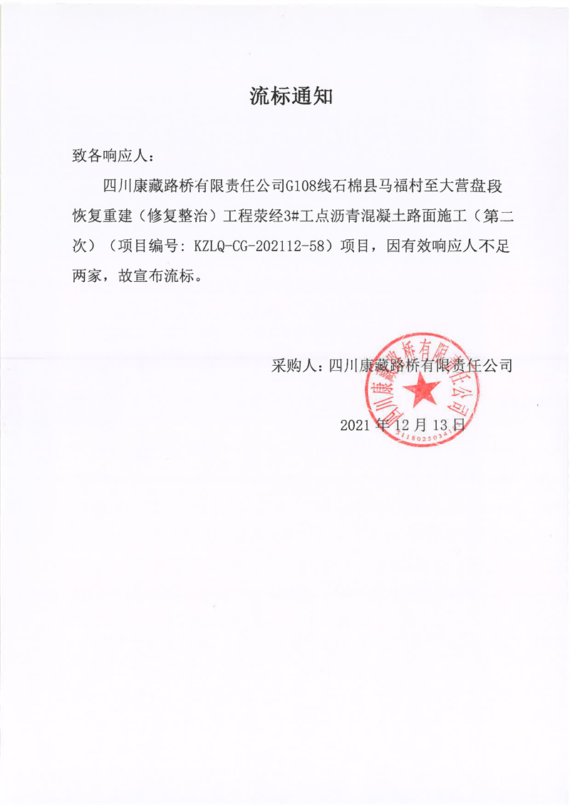 四川康藏路橋有限責(zé)任公司G108線石棉縣馬福村至大營(yíng)盤(pán)段恢復(fù)重建(修復(fù)整治)工程滎經(jīng)3#工點(diǎn)瀝青混凝土路面施工(第二次)流標(biāo)通知