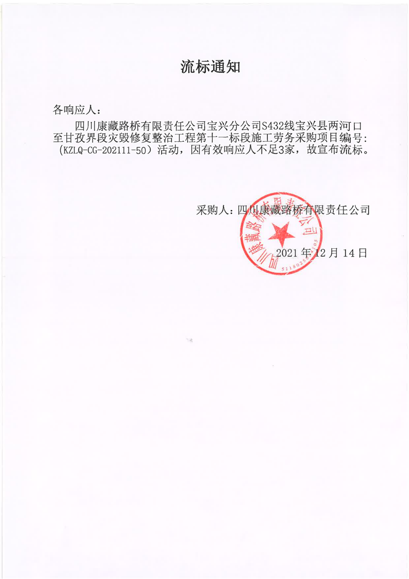 S432線寶興縣兩河口至甘孜界段災(zāi)毀修復(fù)整治工程第十一標段施工勞務(wù)(第二次)流標通知