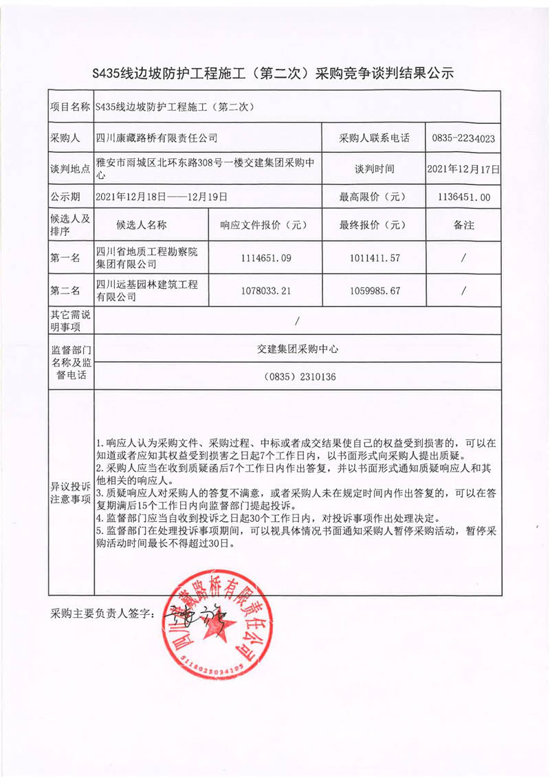 四川康藏路橋有限責(zé)任公司S435線邊坡防護(hù)工程施工(第二次)采購競爭談判結(jié)果公示