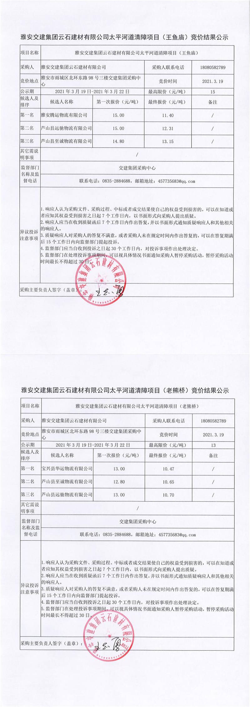 雅安交建集團(tuán)云石建材有限公司太平河道清障項(xiàng)目競(jìng)價(jià)結(jié)果公示