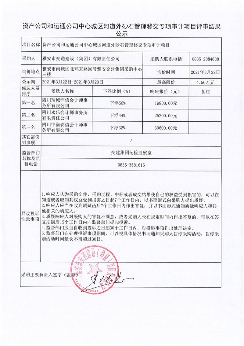 雅安市交通建設(shè)(集團)有限責任公司資產(chǎn)公司和運通公司中心城區(qū)河道外砂石管理移交專項審計項目評審結(jié)果公示