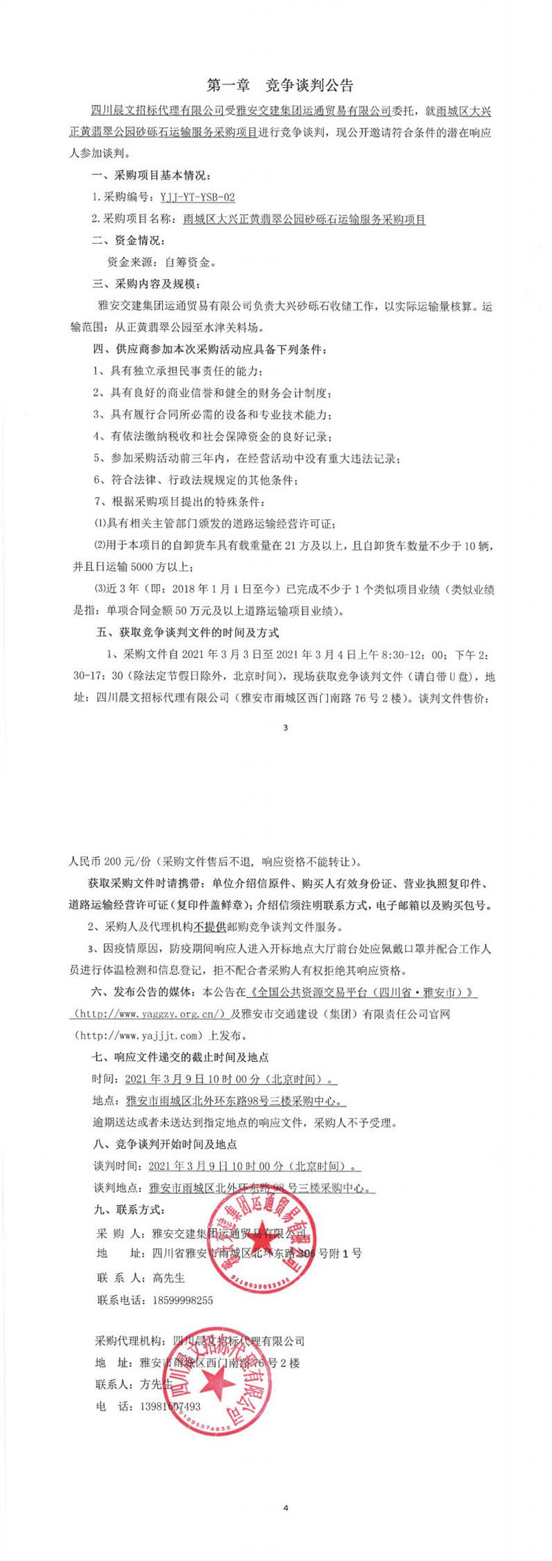 雅安交建集團運通貿(mào)易有限公司雨城區(qū)大興正黃翡翠公園砂礫石運輸服務(wù)采購項目競爭談判公告