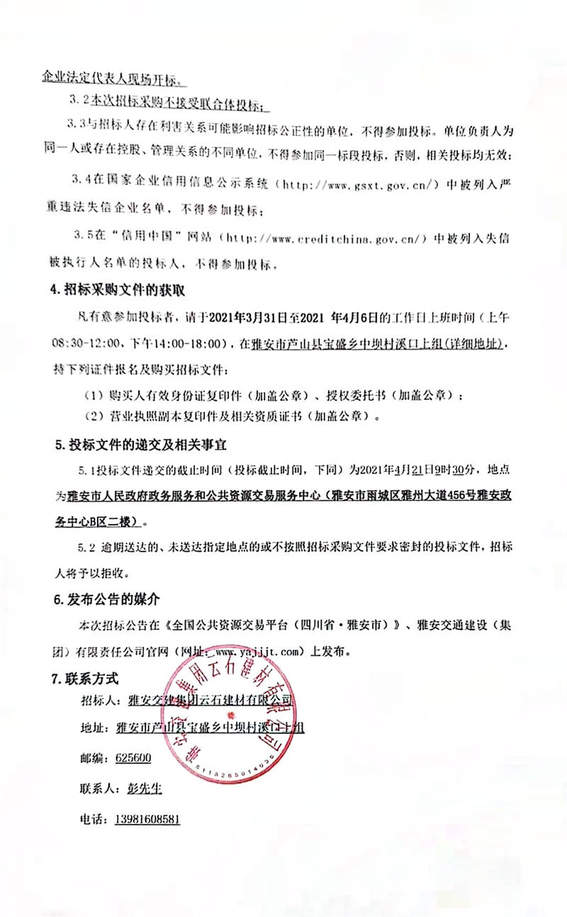 雅安交建集團(tuán)云石建材有限公司日產(chǎn)10000噸砂石骨料生產(chǎn)項(xiàng)目招標(biāo)采購(gòu)公告