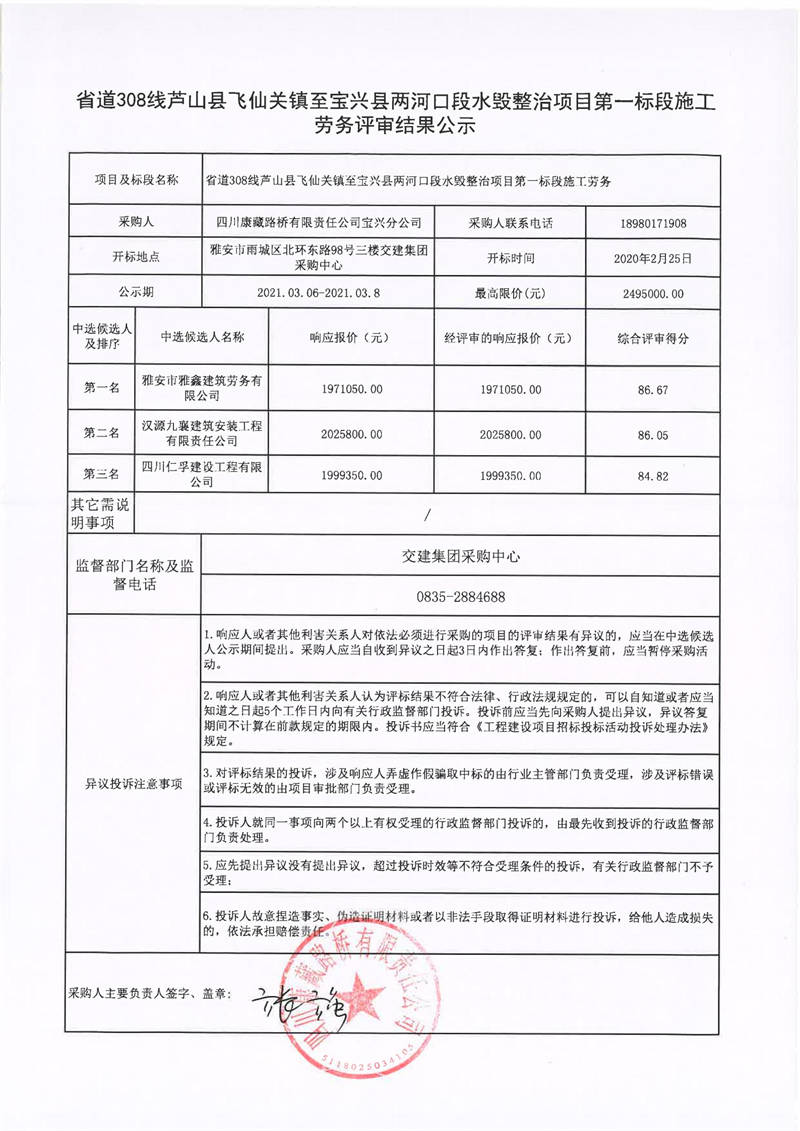 四川康藏路橋有限責(zé)任公司寶興分公司省道308線蘆山縣飛仙關(guān)鎮(zhèn)至寶興縣兩河口段水毀整治項(xiàng)目第一標(biāo)段施工勞務(wù)評審結(jié)果公示