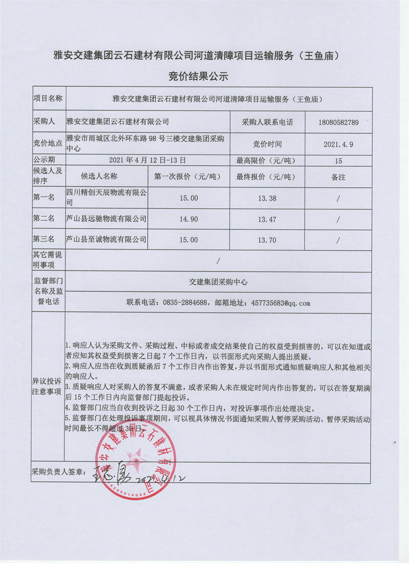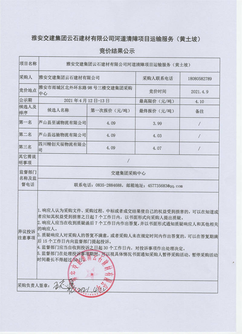雅安交建集團(tuán)云石建材有限公司河道清障項(xiàng)目運(yùn)輸服務(wù)競(jìng)價(jià)結(jié)果公示
