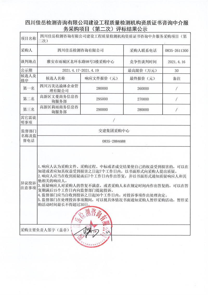 四川佳岳檢測(cè)咨詢有限公司建設(shè)工程質(zhì)量檢測(cè)機(jī)構(gòu)資質(zhì)證書咨詢中介服務(wù)采購項(xiàng)目(第二次)評(píng)標(biāo)結(jié)果公示