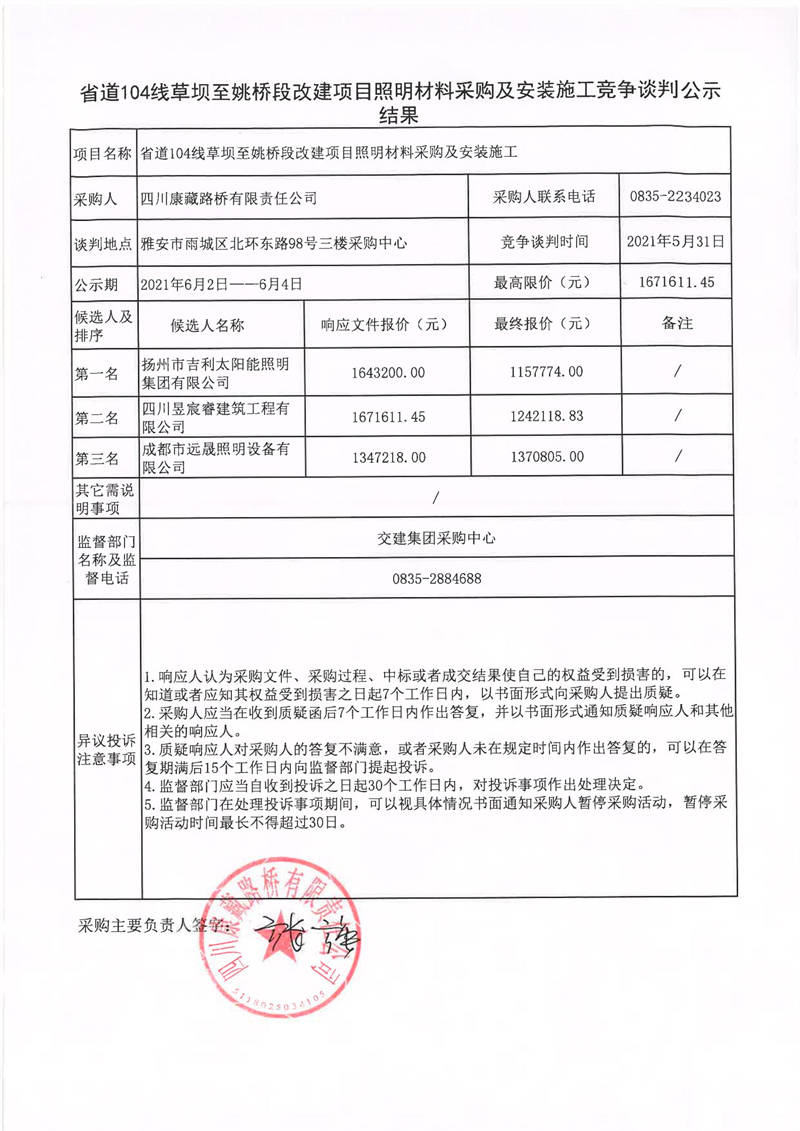 四川康藏路橋有限責(zé)任公司省道104線草壩至姚橋段改建項(xiàng)目照明材料采購及安裝施工競(jìng)爭(zhēng)談判公示結(jié)果