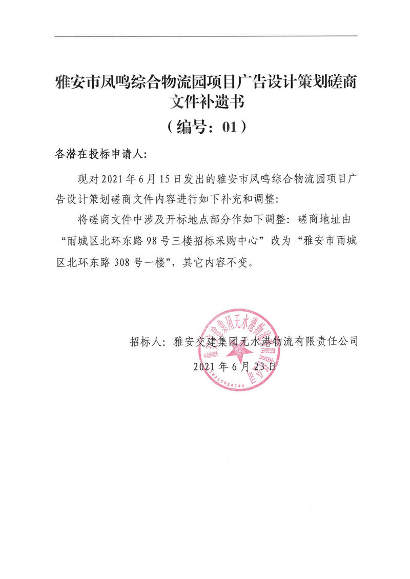 雅安交建集團(tuán)無水港物流有限責(zé)任公司雅安市鳳鳴綜合物流園項(xiàng)目廣告設(shè)計(jì)策劃磋商文件補(bǔ)遺書